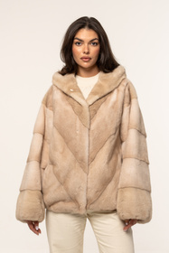 Beżowe futro z kapturem z naturalnych norek palomino