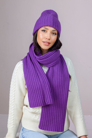 Komplet wełniany szalik oraz czapka z pomponami z naturalnego futra lisa w kolorze fioletowym