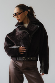 Brązowy kożuch typu ramoneska ze skór jagnięcych