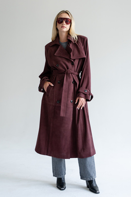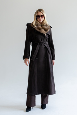 Brązowy zamszowy płaszcz trencz z kołnierzem z futra sobola ze skóry zamszowej