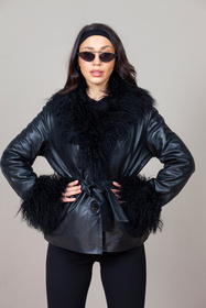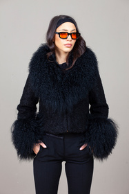 Wełniany czarny żakiet z futrzanym obszyciem z lamy