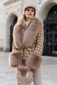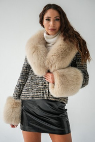 Wełniany żakiet z futrzanym obszyciem w odcieniach czerni i beżu