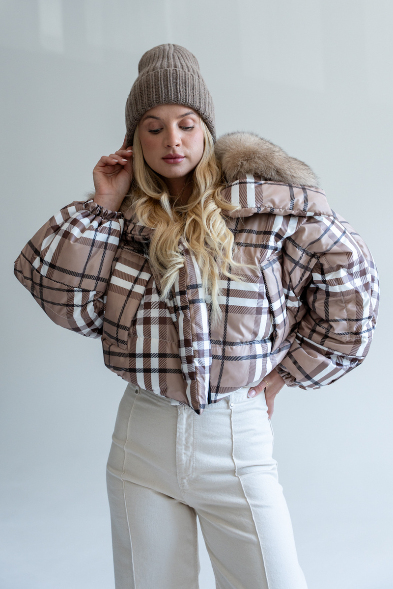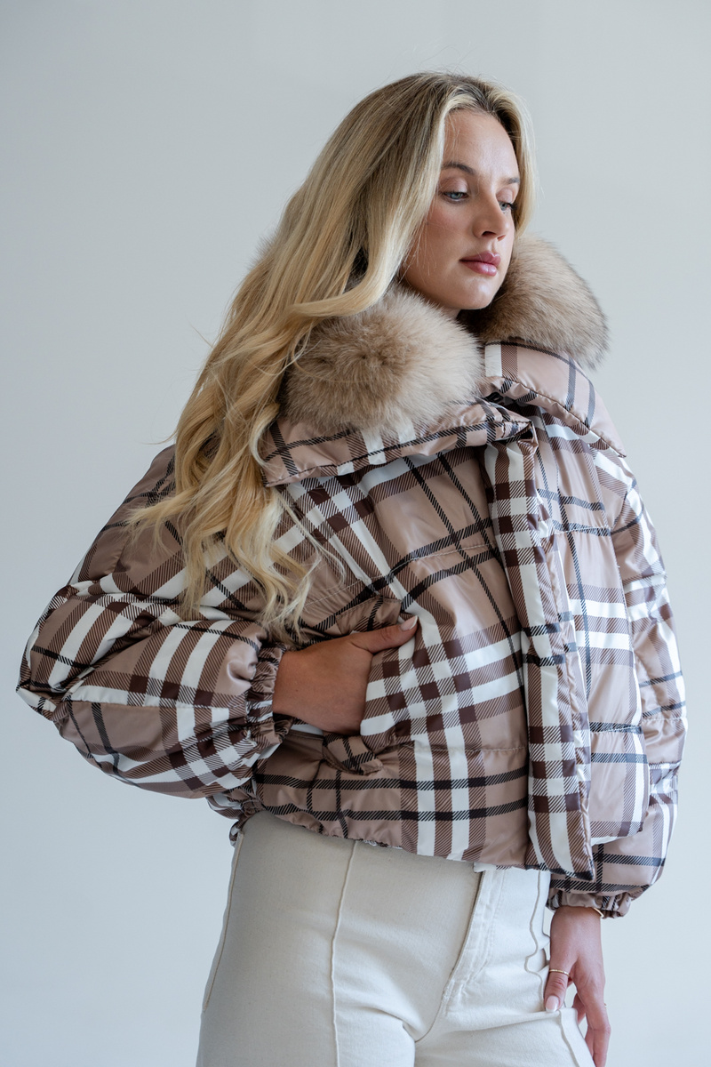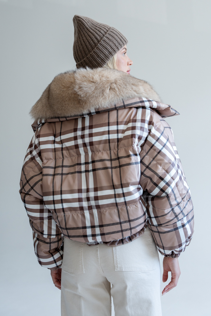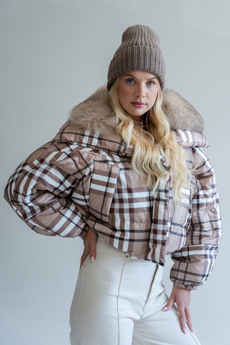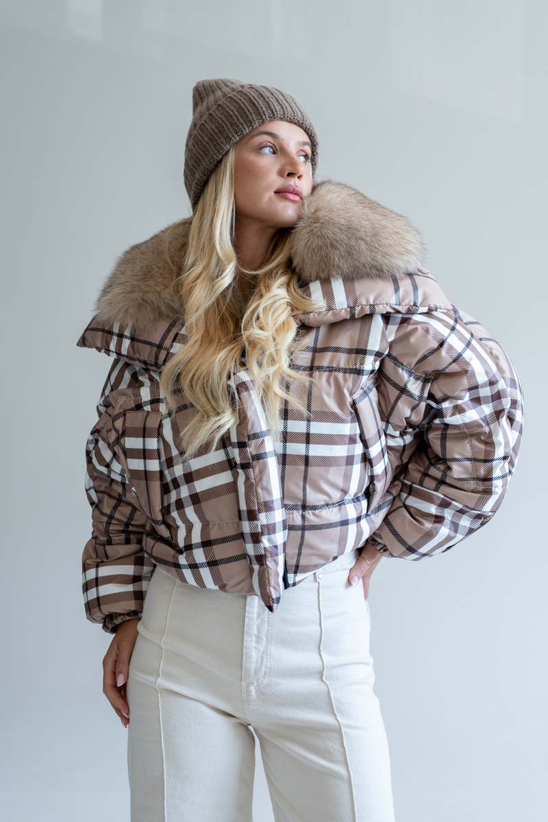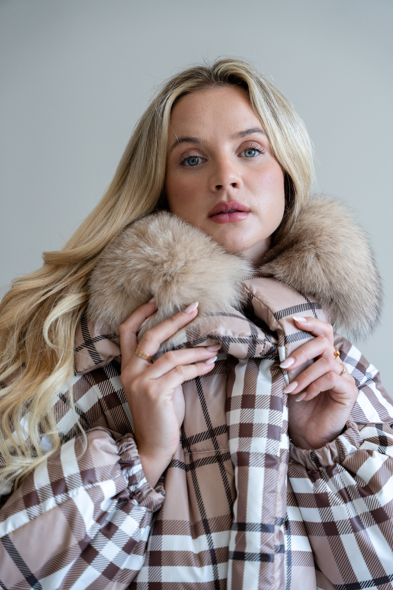Włoska kurtka puchowa w kratę marki Flo&Clo z futrzanym obszyciem