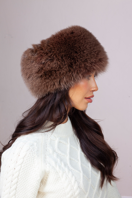 Futrzany damski toczek z naturalnego futra lisa w kolorze brązowym. Elegancki i oryginalny pasujący do każdego typu urody. Fason jest klasyczny i ponadczasowy.Świetnie sprawdzi się do eleganckich stylizacji z wełnianym płaszczem, kożuszkiem oraz będzie idealny na zimowy wyjazd w góry.