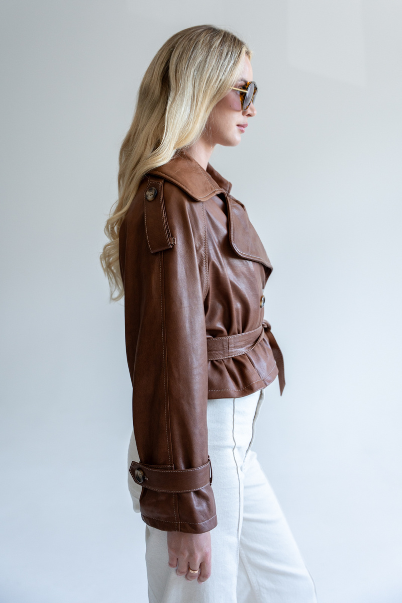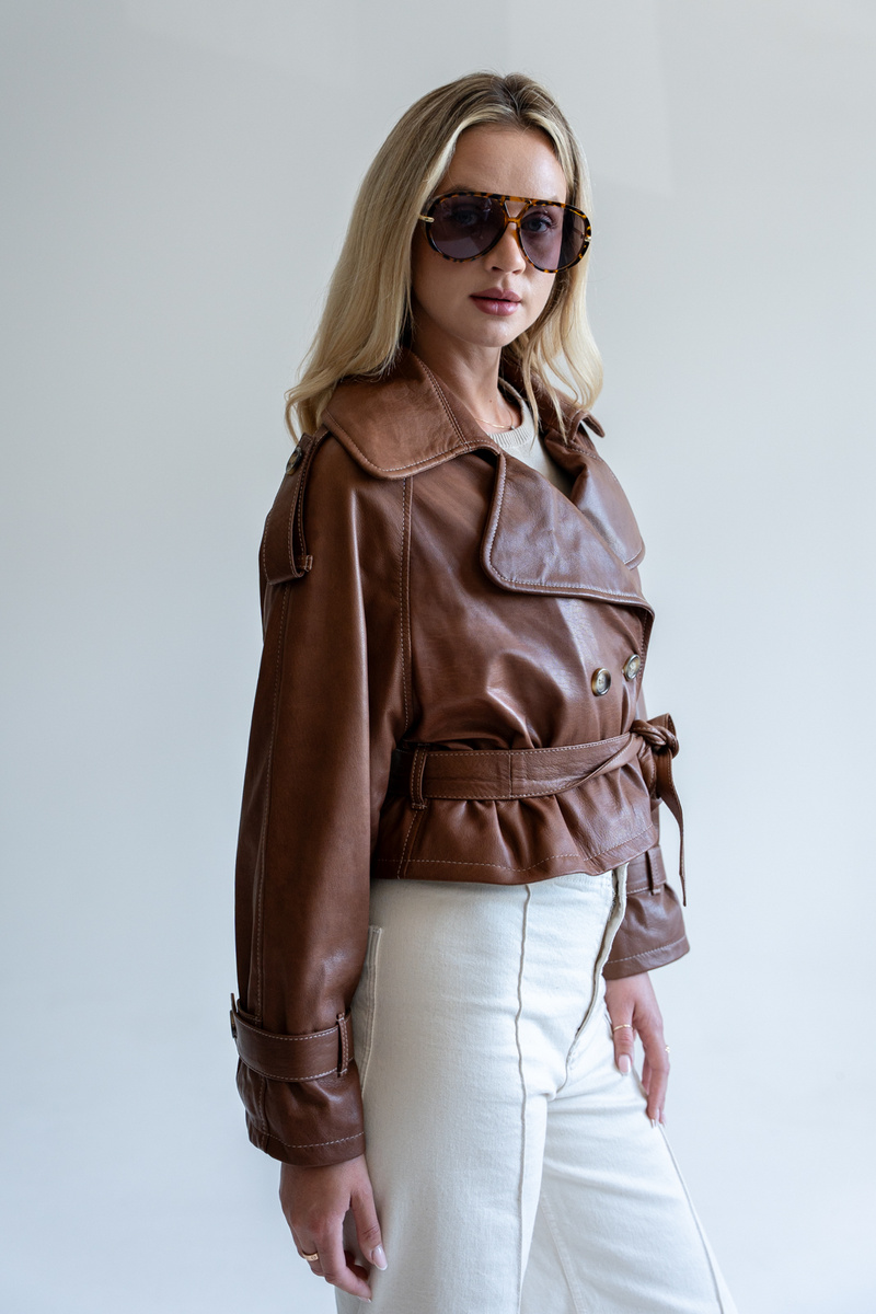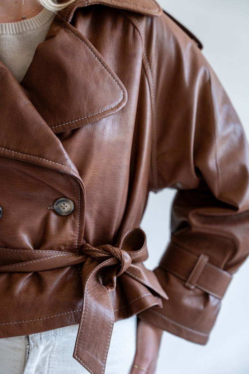 Kurtka typu trench wykonana z najwyższej jakości włoskich skór jagnięcych w kolorze jasnego brązu.