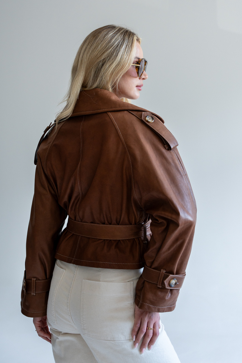Brązowy krótki trench z naturalnej skóry