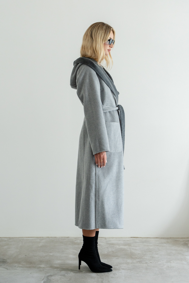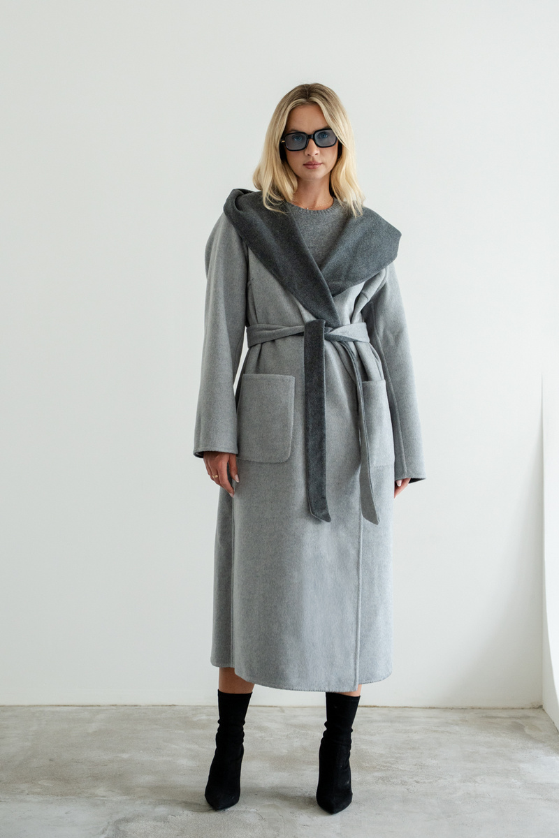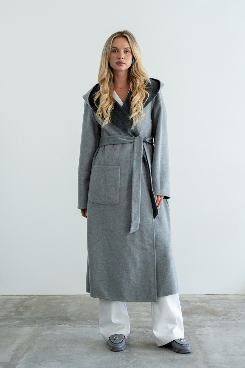 Elegancki dwustronny płaszcz z kapturem o swobodnym kroju uszyty z najwyższej jakości włoskiego kaszmiru - nie posiada podszewki. W talii wiązany paskiem bez dodatkowych zapięć. Krawiecki kunszt uwidoczniony w cięciach wysmuklających sylwetkę. Posiada dopracowany w każdym calu krój, podkreślający kobiecą sylwetkę. W talii wiązany paskiem. Z tyłu posiada rozporek. Taki płaszcz w Twojej szafie to inwestycja na lata! Zakładaj go do szpilek lub botków na obcasie. Uniwersalny i praktyczny sprawdzi się w każdej sytuacji oraz zapewni Ci komfort podczas chłodnych, jesienno-zimowych dni. Kolor: szary