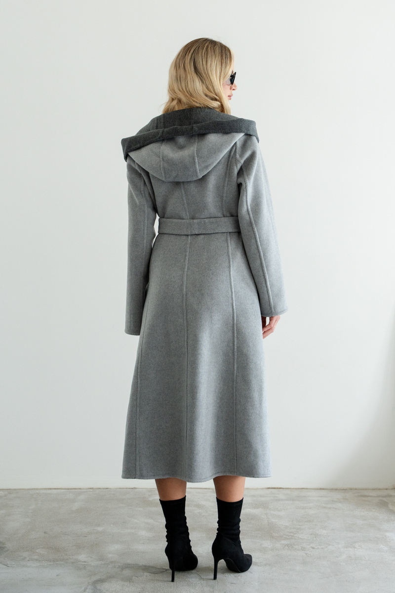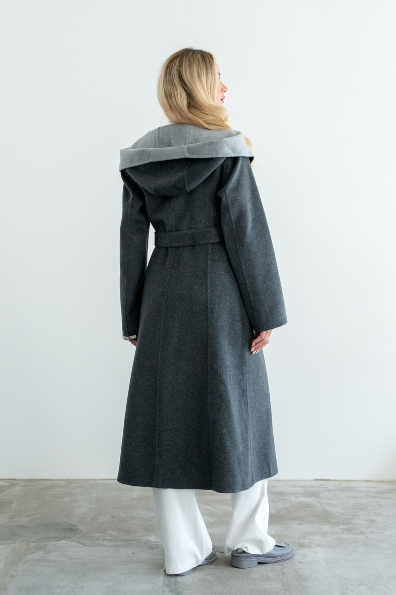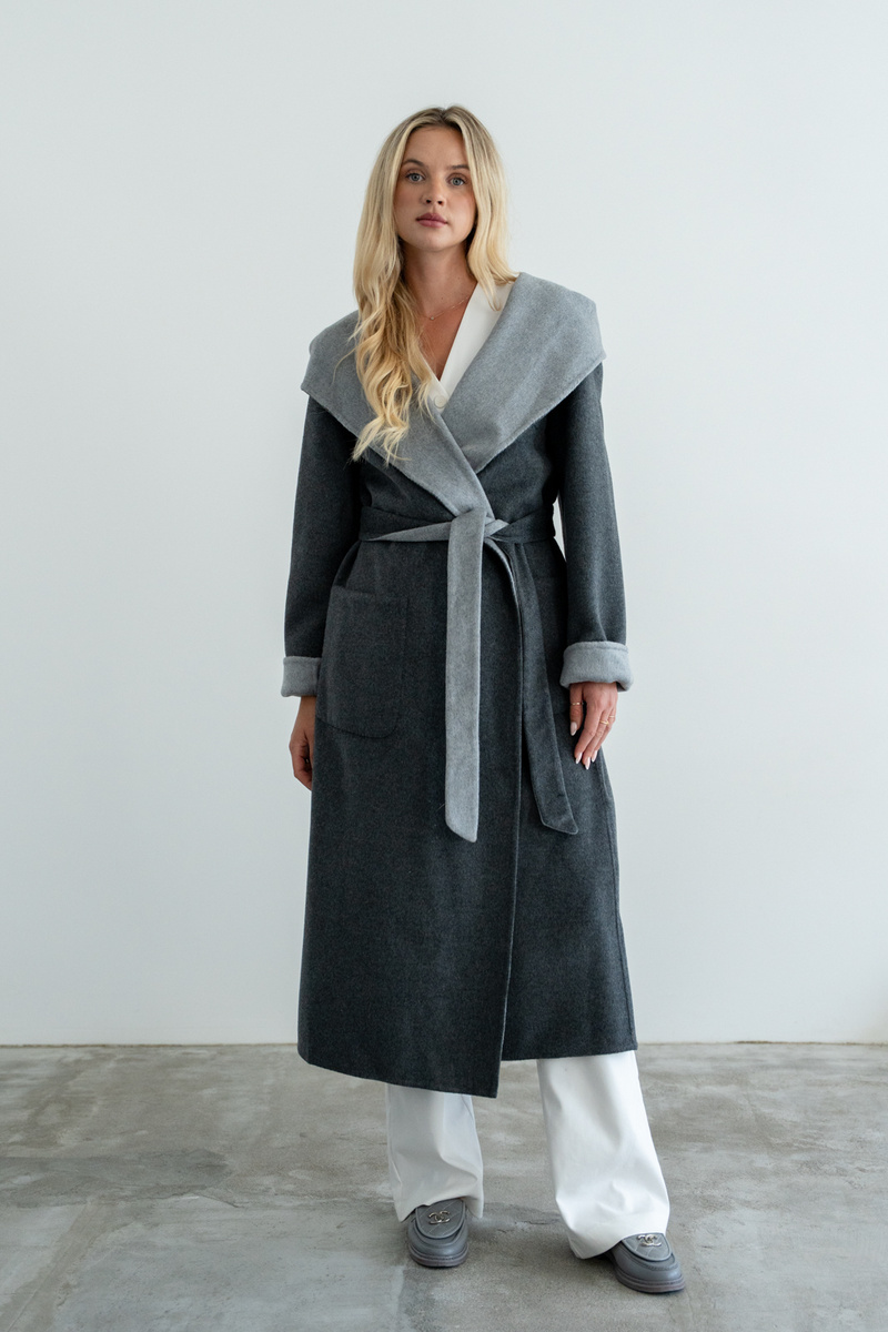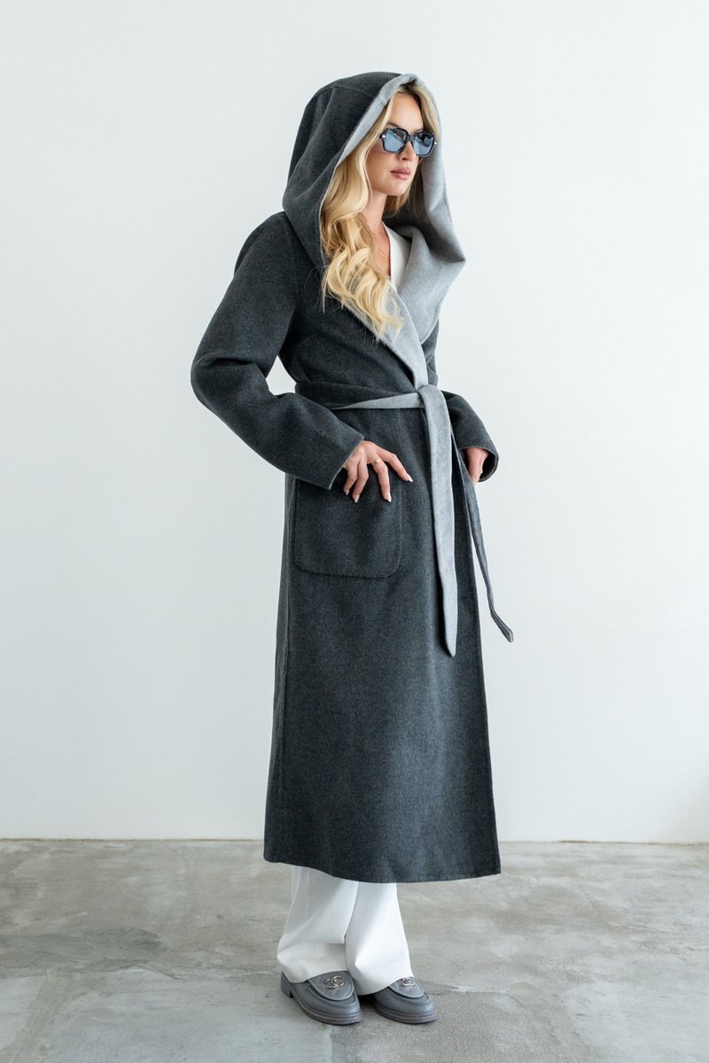 Elegancki dwustronny płaszcz z kapturem o swobodnym kroju uszyty z najwyższej jakości włoskiego kaszmiru - nie posiada podszewki. W talii wiązany paskiem bez dodatkowych zapięć. Krawiecki kunszt uwidoczniony w cięciach wysmuklających sylwetkę. Posiada dopracowany w każdym calu krój, podkreślający kobiecą sylwetkę. W talii wiązany paskiem. Z tyłu posiada rozporek. Taki płaszcz w Twojej szafie to inwestycja na lata! Zakładaj go do szpilek lub botków na obcasie. Uniwersalny i praktyczny sprawdzi się w każdej sytuacji oraz zapewni Ci komfort podczas chłodnych, jesienno-zimowych dni. Kolor: szary