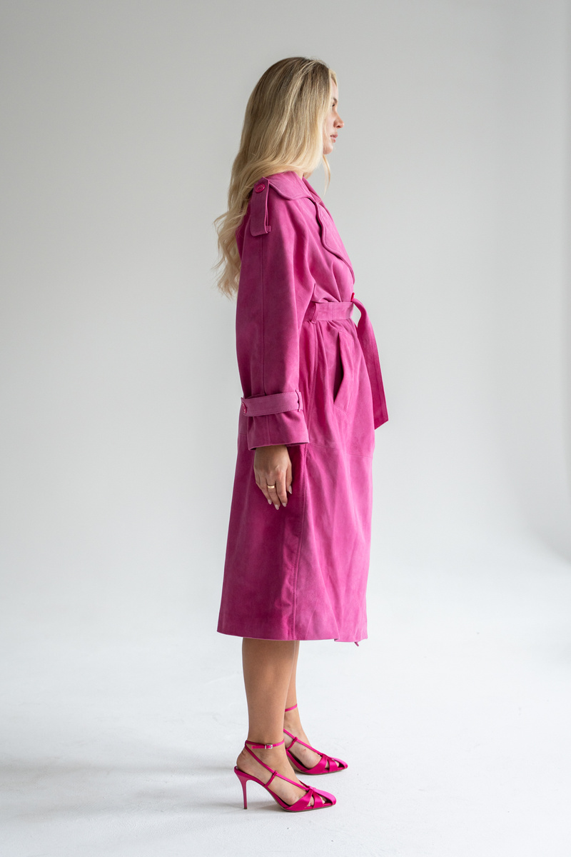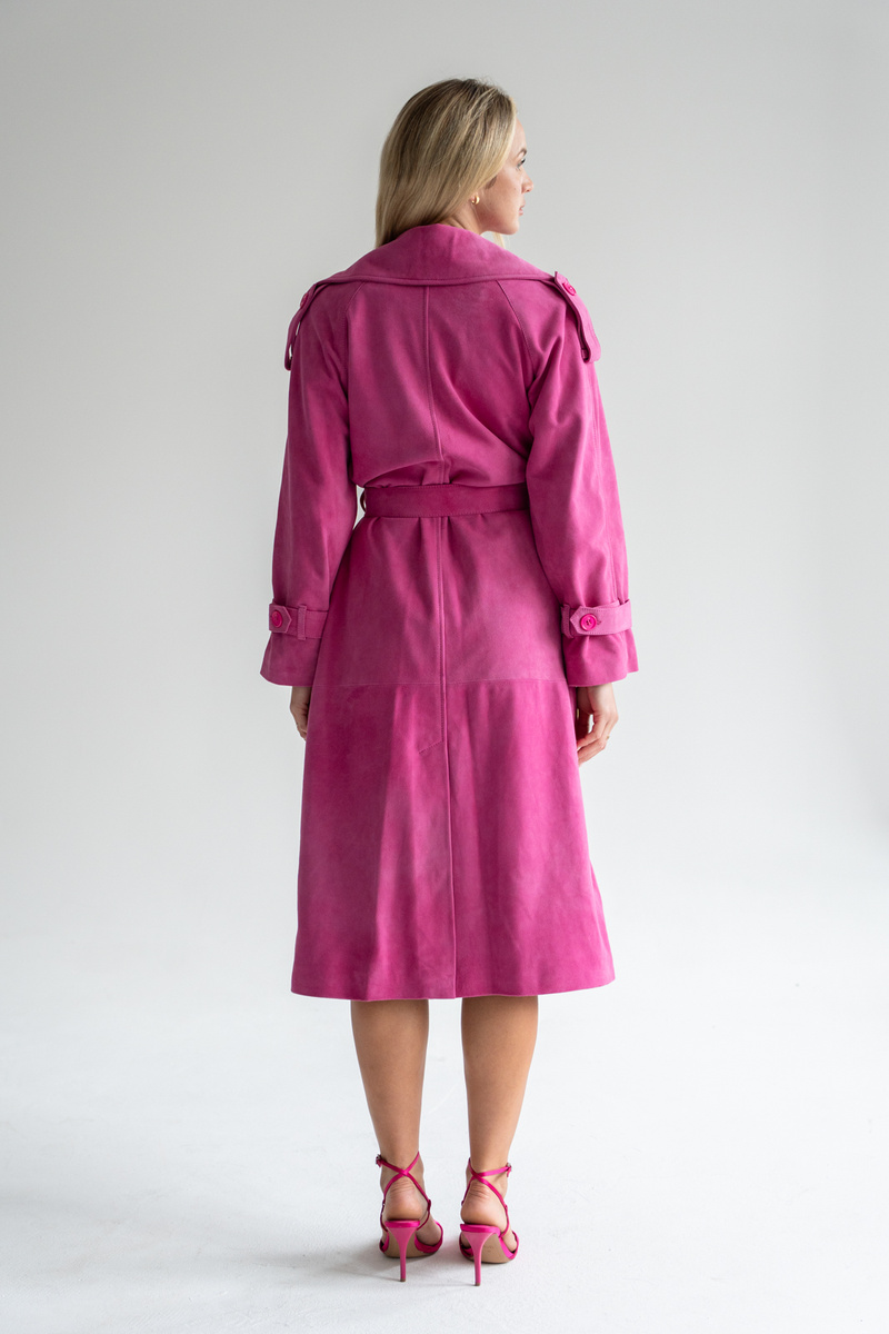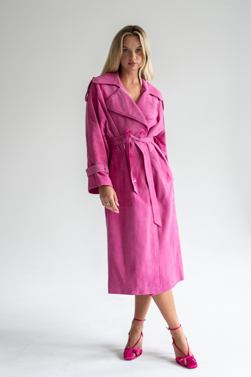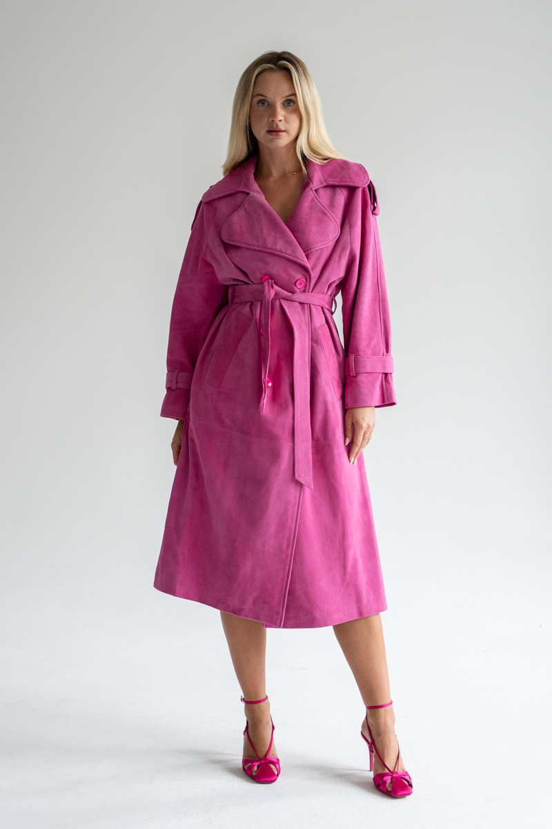 - Jesienny płaszcz Trench wykonany z najwyższej jakości włoskiej skóry jagnięcej typu zamsz. Posiada dopracowany w każdym calu krój, podkreślający kobiecą sylwetkę a szczególnie talię.Taki płaszcz w Twojej szafie to inwestycja na lata!