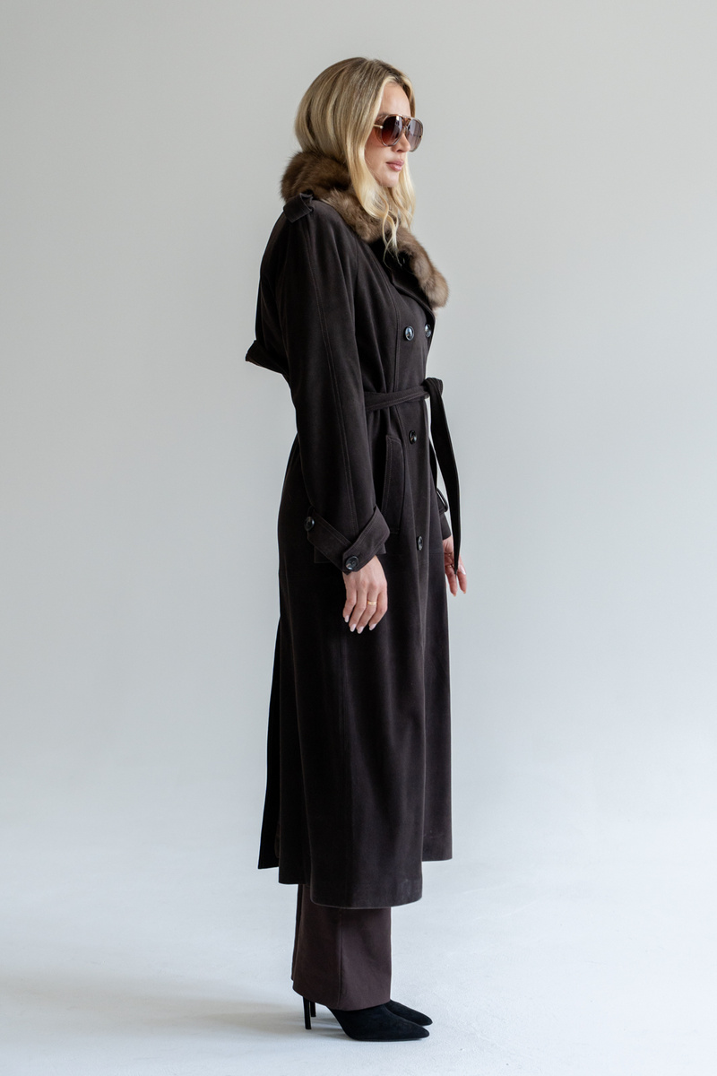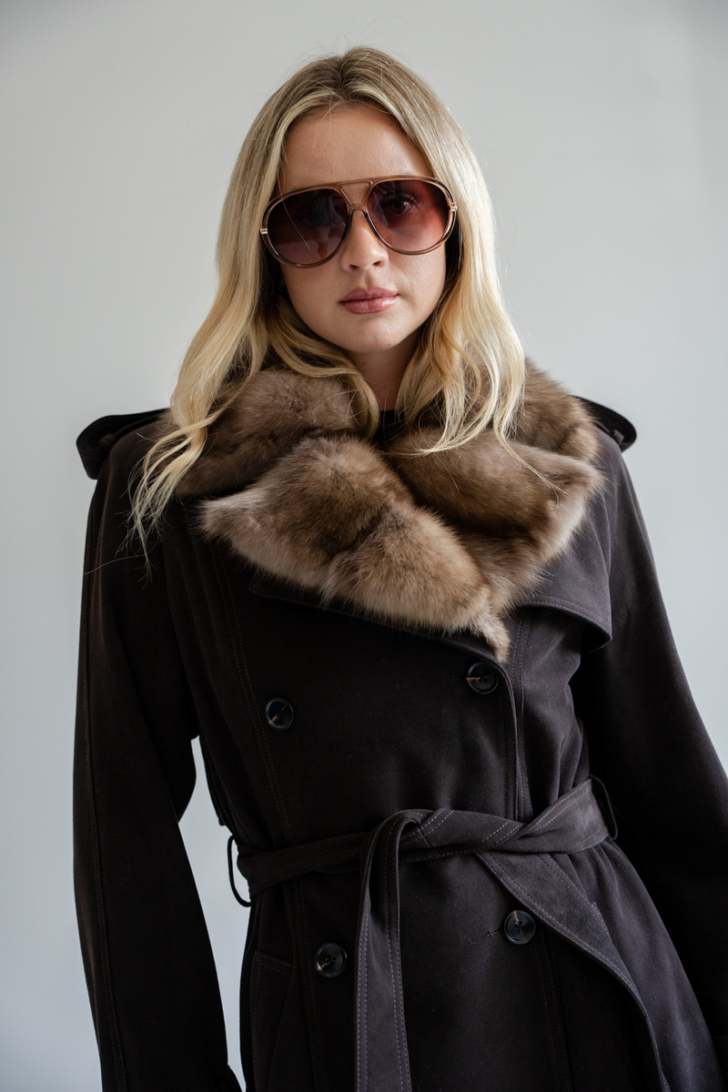 Brązowy zamszowy płaszcz trencz z kołnierzem z futra sobola ze skóry zamszowej