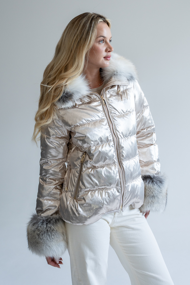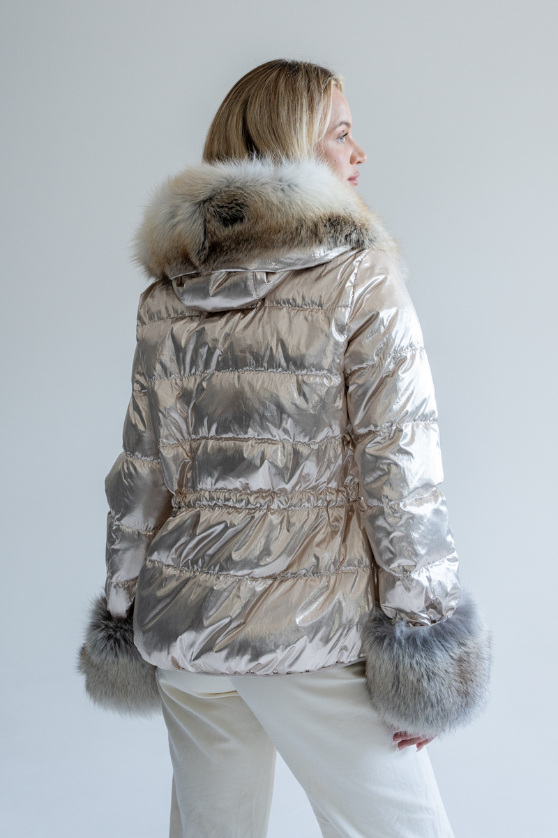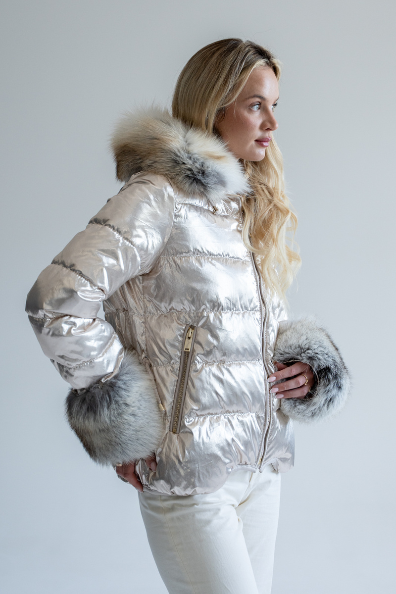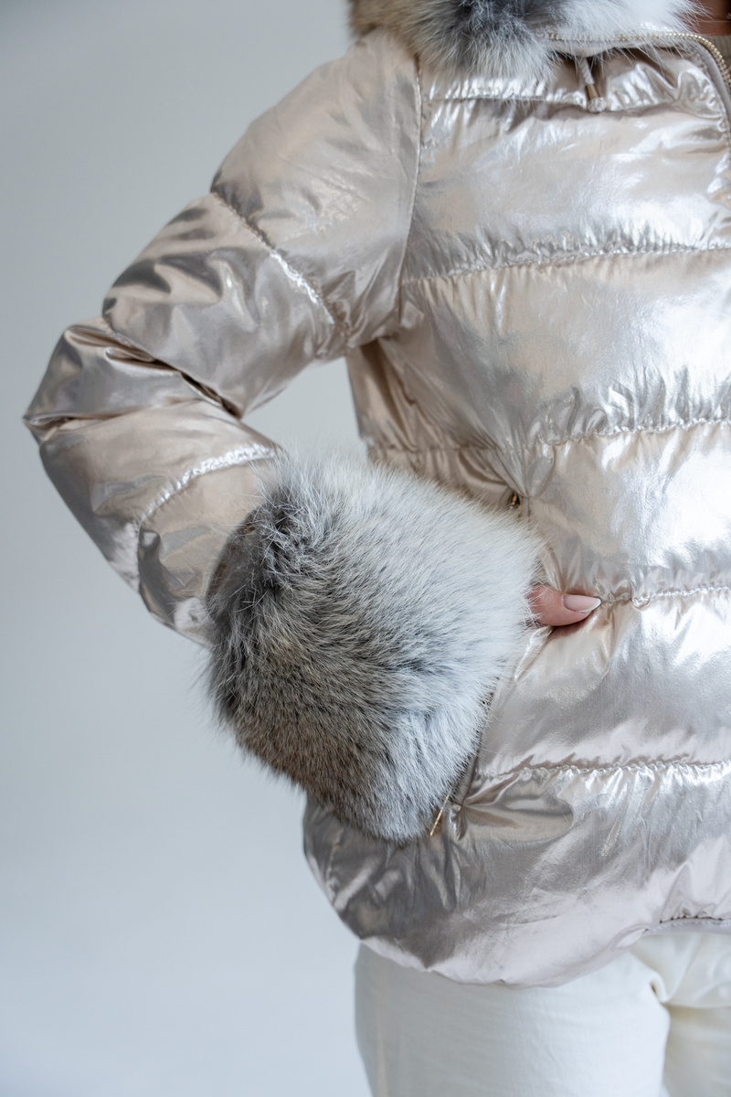 Luksusowa kurtka puchowa włoskiej marki Flo&Clo stworzona z myślą o kobietach, które cenią elegancję i komfort w sezonie zimowym. Jej metaliczny perłowy połysk nadaje stylizacji nowoczesnego charakteru, a efektowne obszycia z naturalnego futra lisa fińskiego przy kapturze i mankietach podkreślają prestiżowy design.
