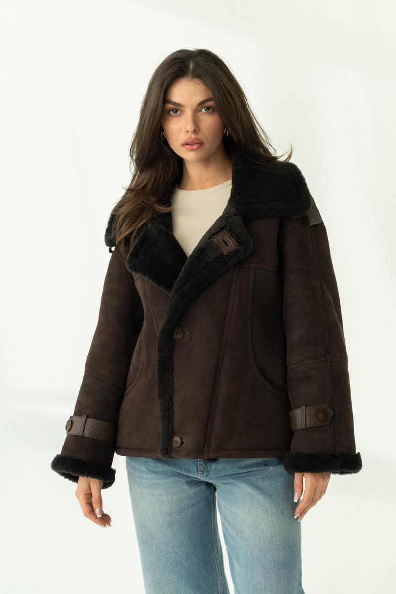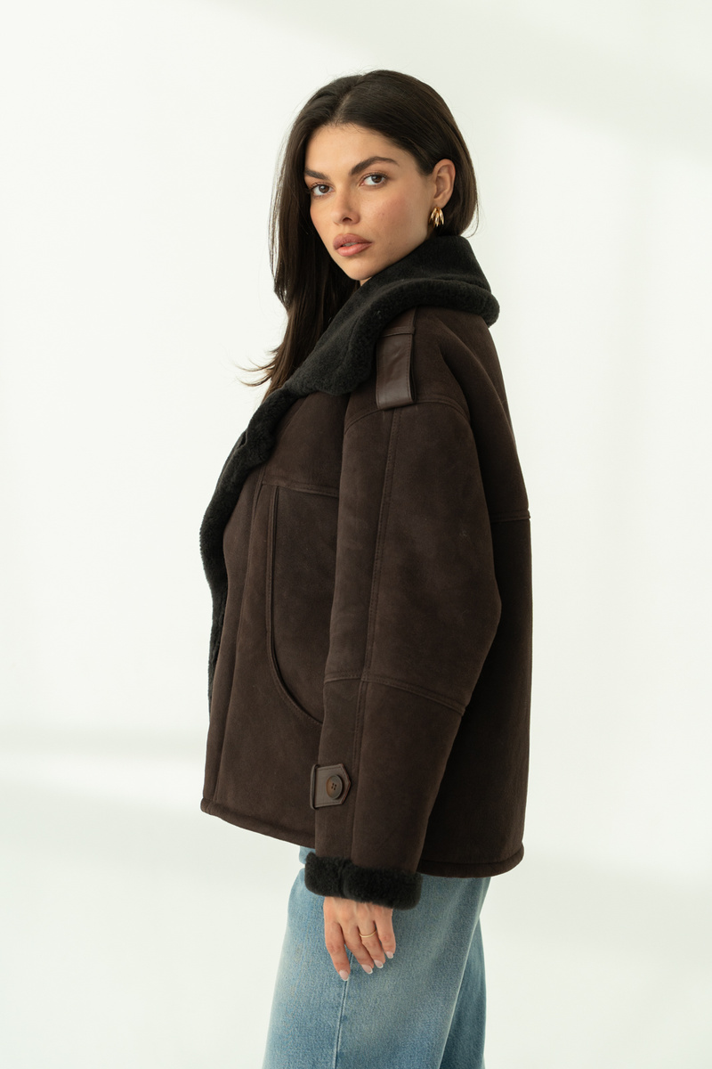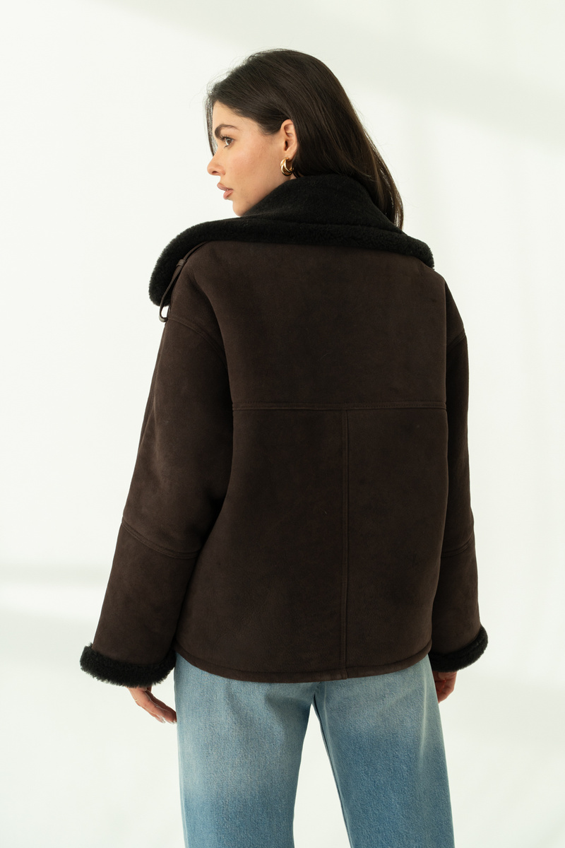 Brązowy kożuch pilotka o klasycznym fasonie z brązowym futerkiem (kożuch jagnięcy).