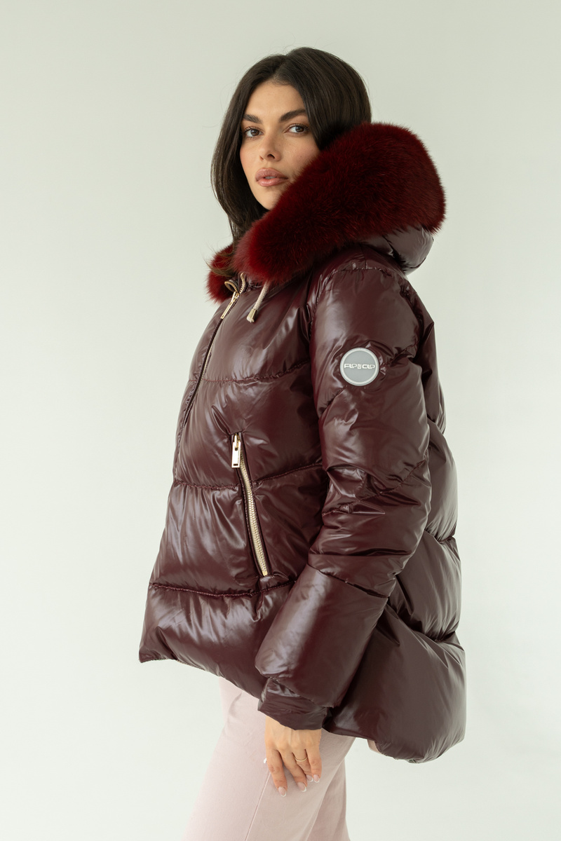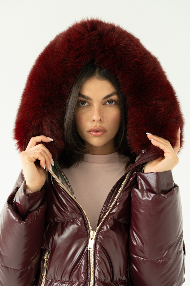 Subtelny bordowy odcień z połyskiem nadaje stylizacji nowoczesnego charakteru, a efektowne obszycia z naturalnego futra lisa fińskiego przy kapturze podkreślają prestiżowy design.