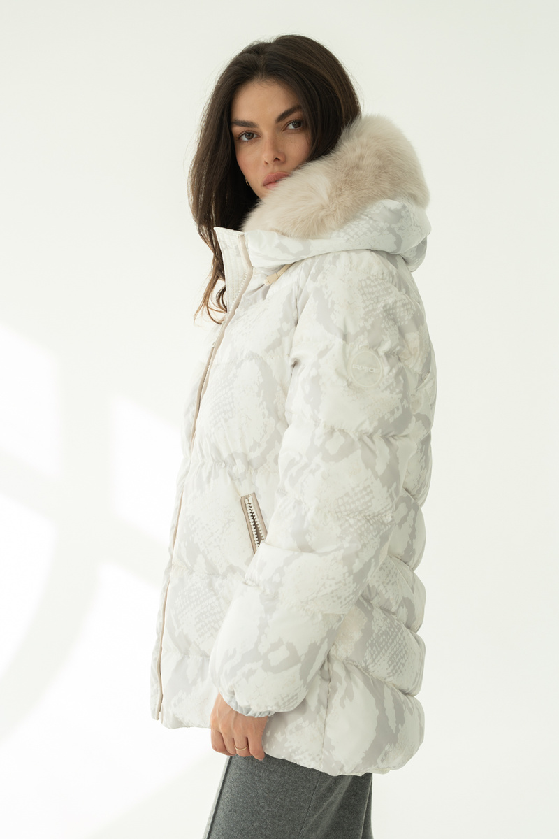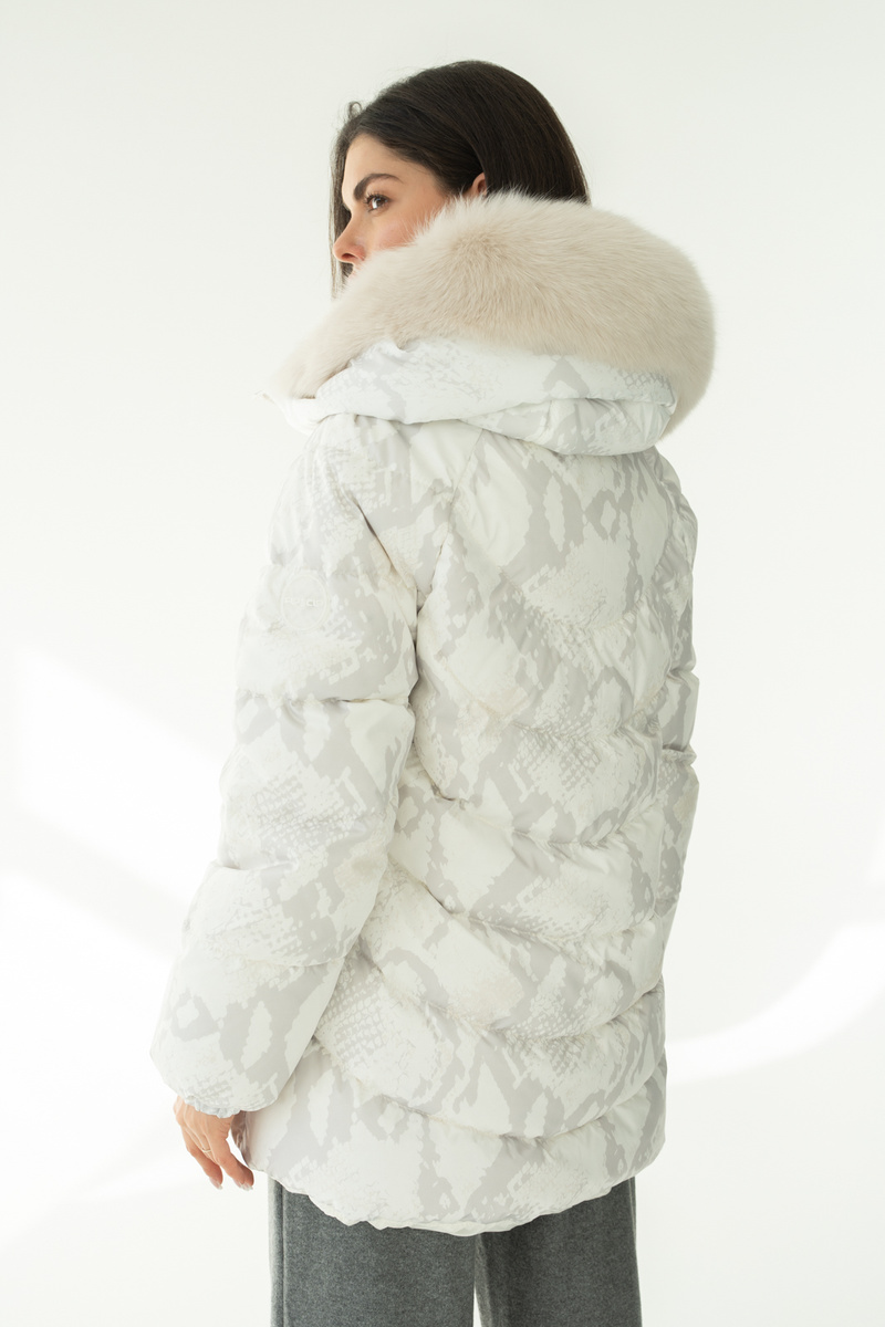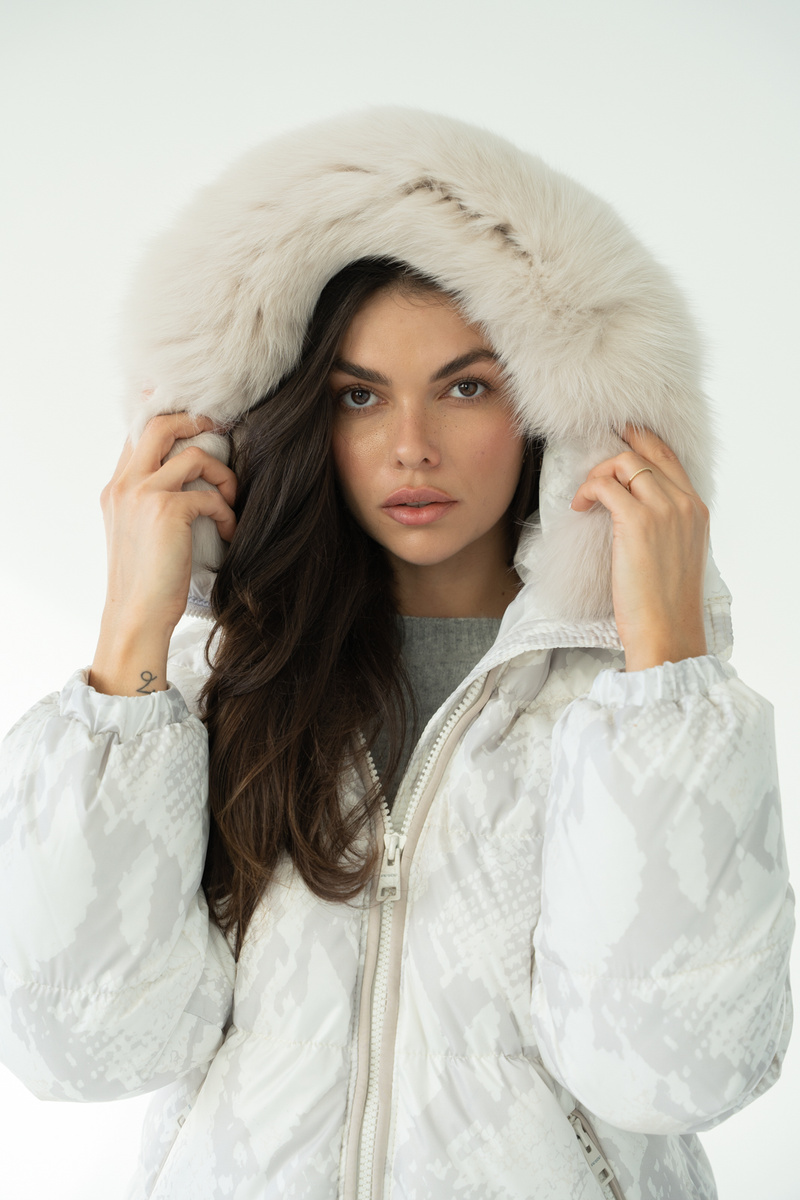 Subtelny biały kolor delikatnie uzupełnia delikatny print w wężowy motyw w odcieniu delikatnej szarości, co nadaje stylizacji nowoczesnego charakteru, a efektowne obszycia z naturalnego futra lisa fińskiego przy kapturze podkreślają prestiżowy design.