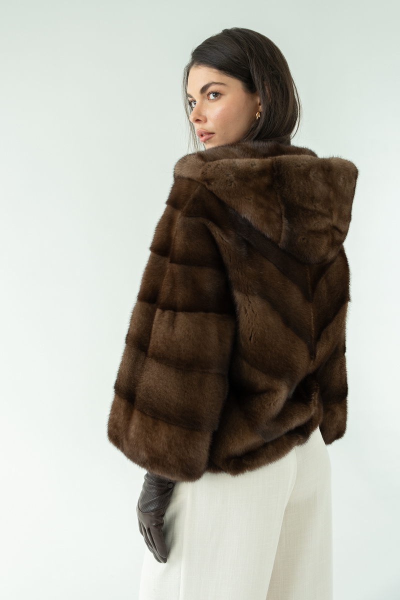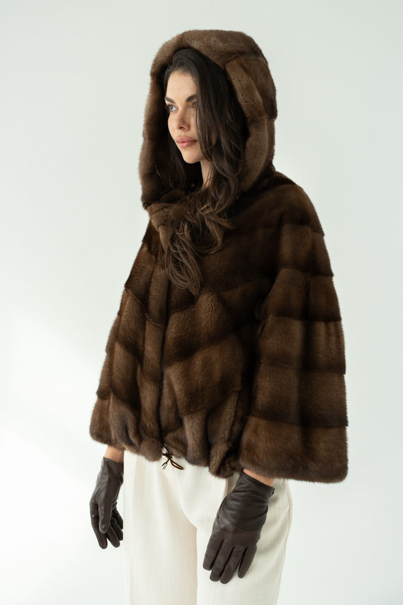 Brązowe futro z kapturem z naturalnych norek