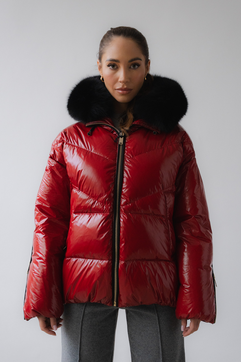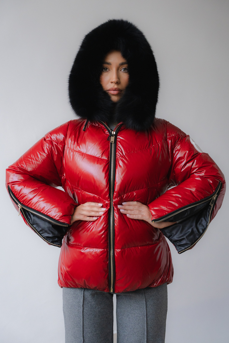 Unikatowa zimowa kurtka Sissi wykonana z najwyższej jakości materiału w technologi Olmetex - nieprzepuszczającego wilgoci oraz wiatru o satynowym wykończeniu połyskującej czerwieni z czarnymi dodatkami. Zapewni Ci komfort, ciepło oraz świetny styl każdego zimowego dnia. Dzięki niej wyróżnisz sie z tłumu i nikt nie przejdzie obok Ciebie obojętnie.Kurtka zapinana jest na zamek błyskawiczny, posiada kieszenie boczne oraz pasek w tali. Kurtki dostępne stacjonarnie w naszych butikach w Warszawie oraz w Zielonej Górze. Długość całkowita: 77 cm Wypełnienie: puch kaczy