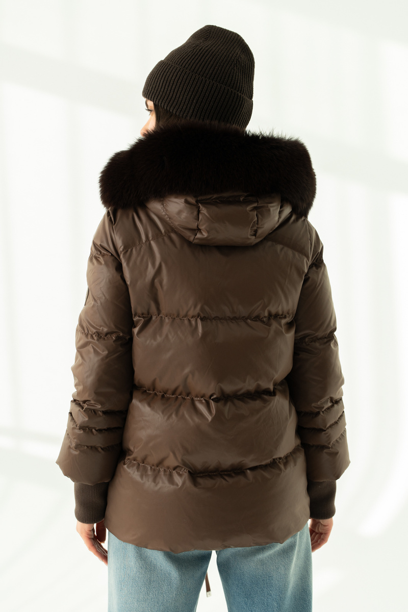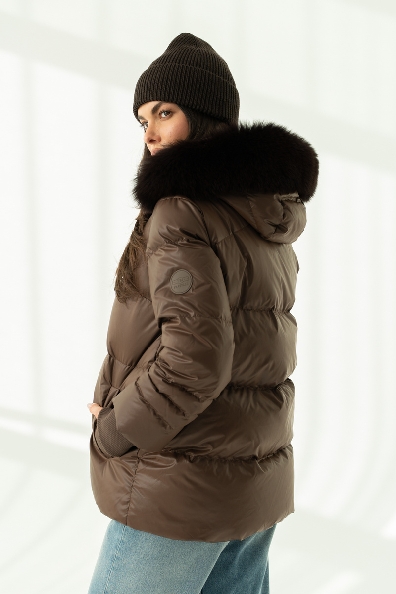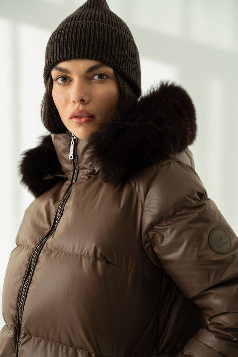Subtelny brązowy odcień w macie nadaje stylizacji nowoczesnego charakteru, a efektowne obszycia z naturalnego futra lisa fińskiego przy kapturze podkreślają prestiżowy design.