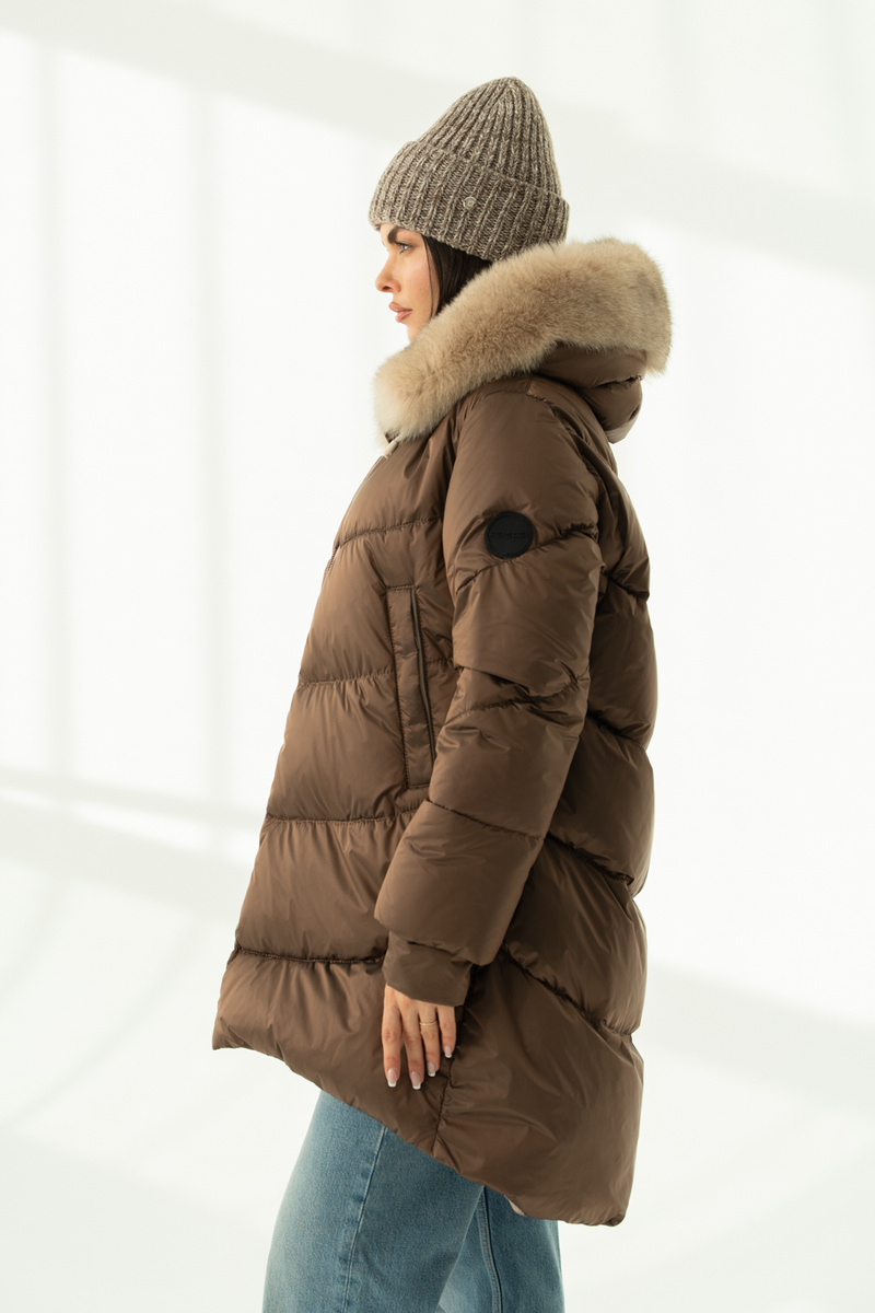 Subtelny beż z połykiem delikatnej miedzi nadaje stylizacji nowoczesnego charakteru, a efektowne obszycia z naturalnego futra lisa fińskiego przy kapturze podkreślają prestiżowy design.