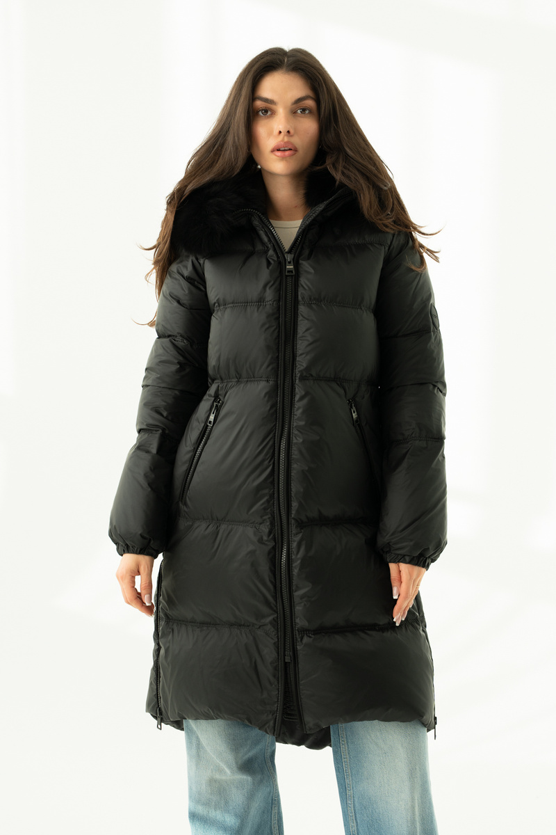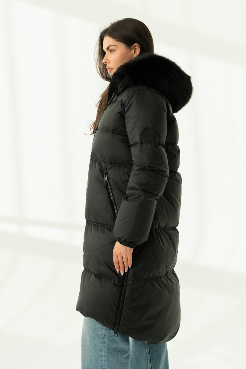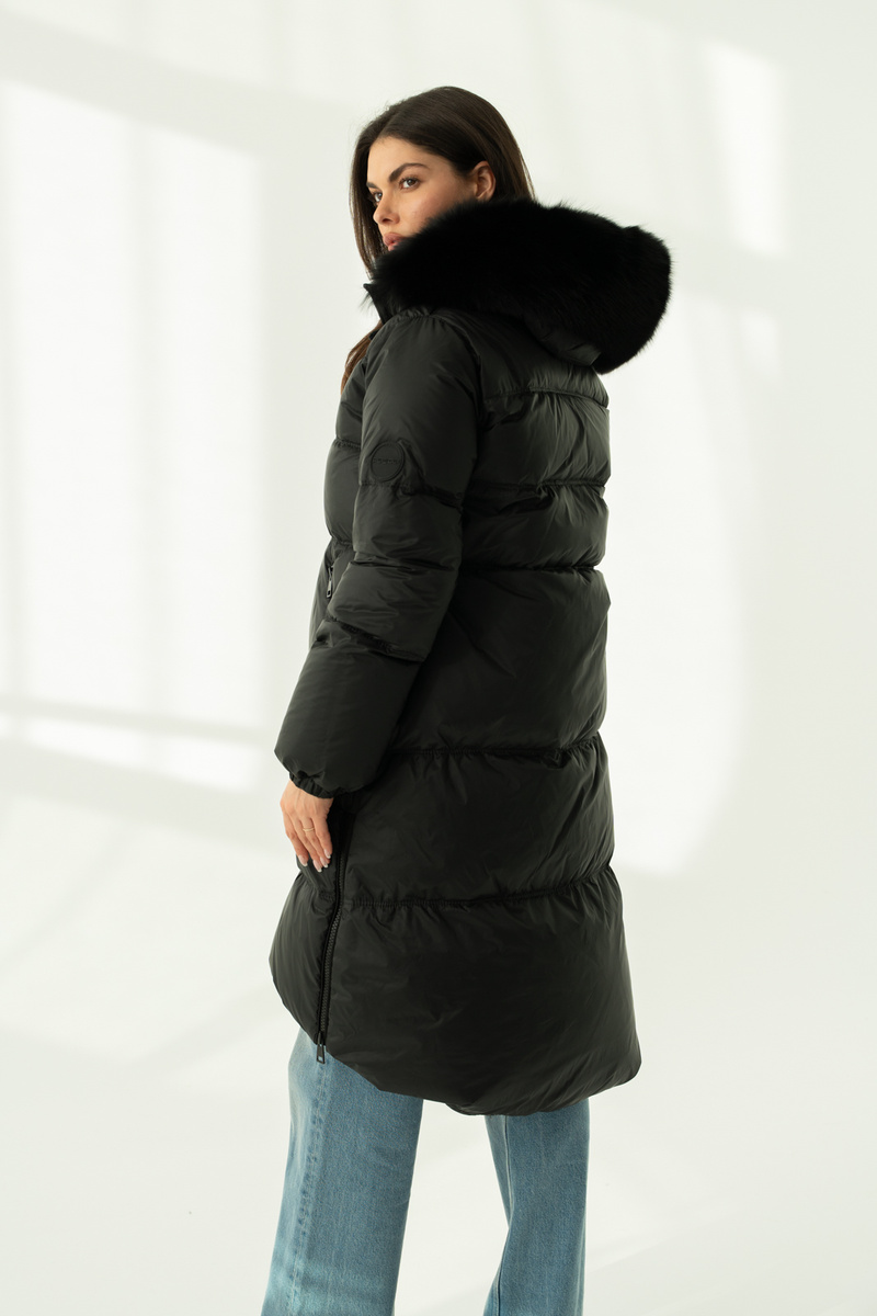 Subtelna i zarazem klasyczna czerń pięknie komponuje sie z futrzanym obszyciem, co nadaje stylizacji nowoczesnego charakteru, a efektowne obszycia z naturalnego futra lisa fińskiego przy kapturze podkreślają prestiżowy design.