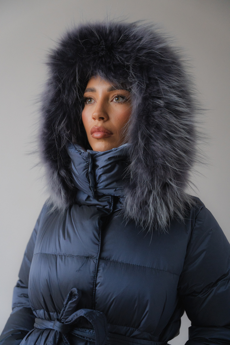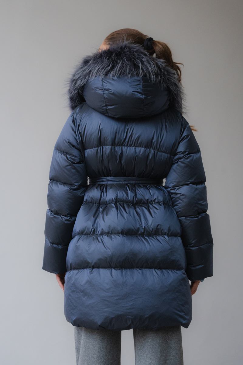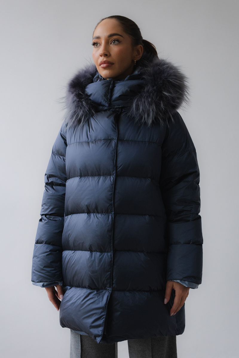 - Ekskluzywna puchowa włoskiej marki Flo&Clo wykonana z najwyższej jakości materiałów. Wygodny i efektowny fason w odcieniu granatu z kontrastującą błękitna podszewką.Na kapturze futrzane obszycie z jenota.