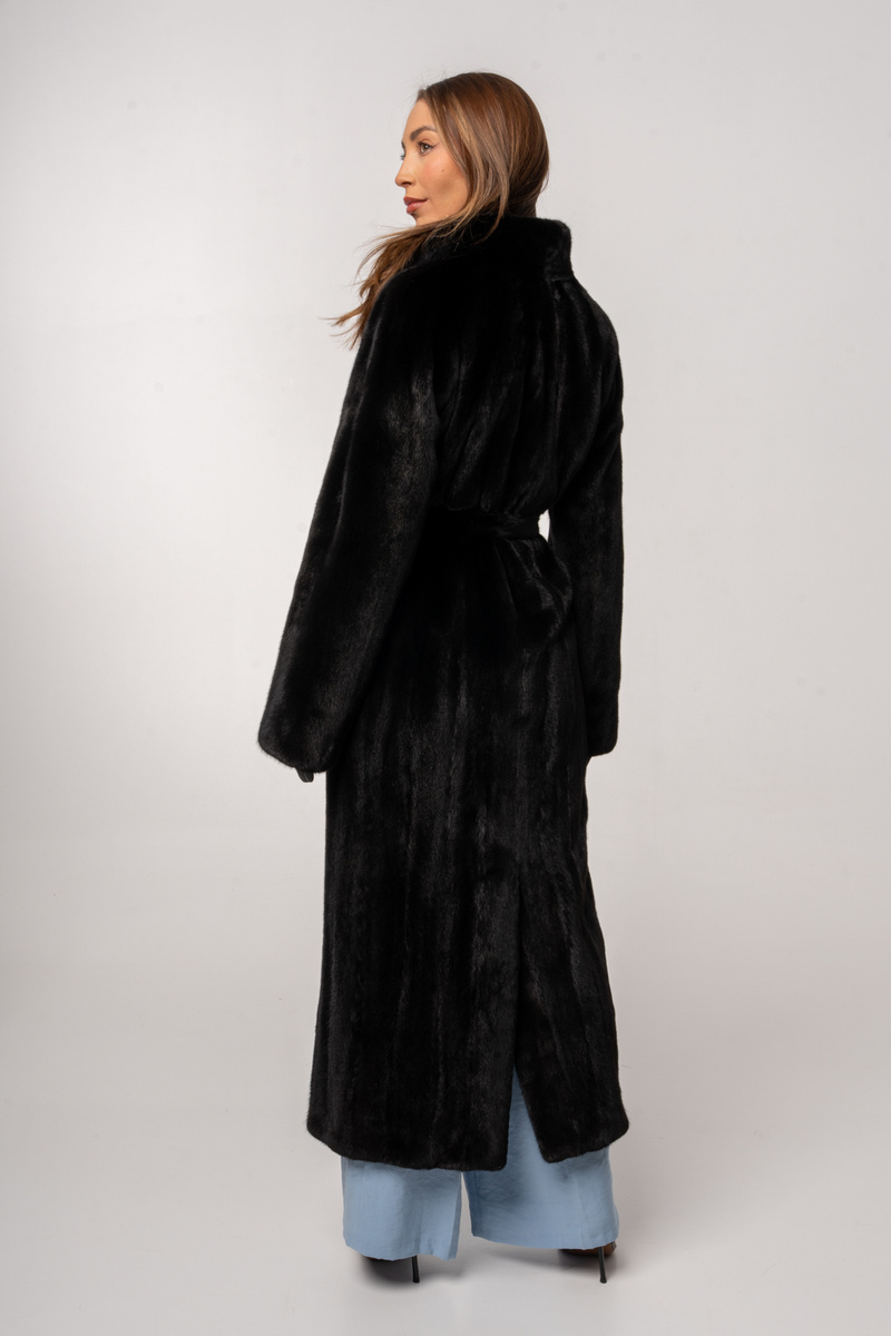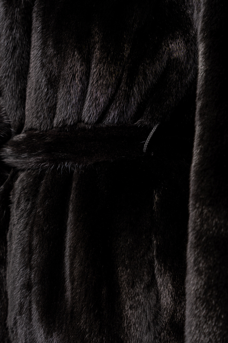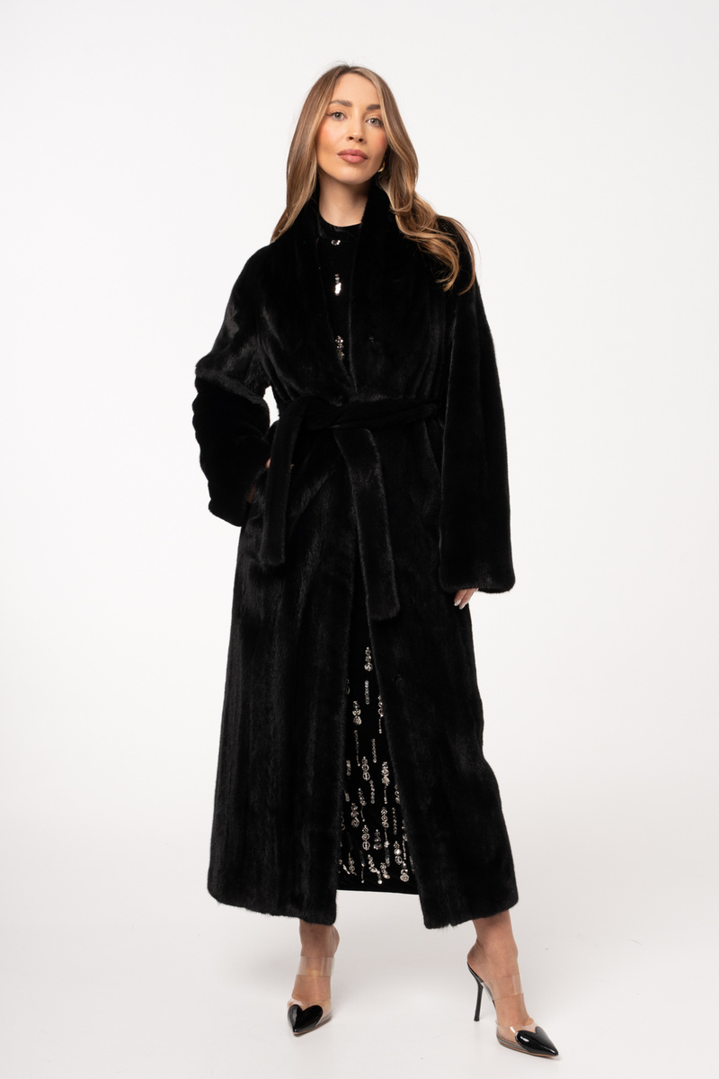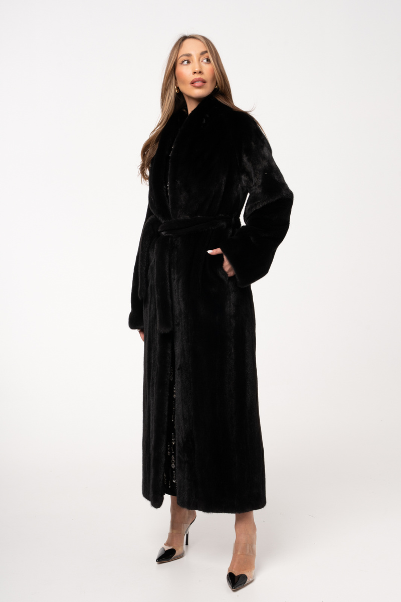 Efektowe długie futro naturalne futro wykonane z najwyższej jakości norek NAFA furs typu Blackglama w naturalnym kolorze głębokiej czerni, norki pochodzą z domu aukcyjnego NAFA furs w Kanadzie norka ta cechuje się bardzo gęstym, krótkim włosem o wysokim połysku, co wyróżnia ją wśród pozostałych gatunków norek. Klasyczny fason tego futra sprawia, iż pięknie się prezentuje oraz może być noszone na wiele okazji. Fason klasyczny, posiada kołnierz szalowy, kieszenie boczne, oraz jedną kieszeń wewnętrzna. Możliwość noszenia z paskiem lub bez. Fason szyty metodą galonowania, dzieki temu nie widoczne są łączenia ani szwy. Futro jest niewykle lekkie i komfortowe.