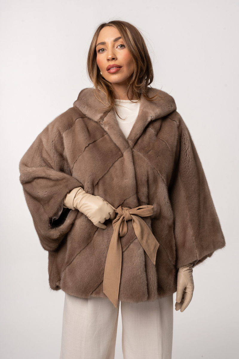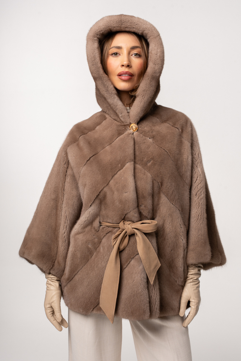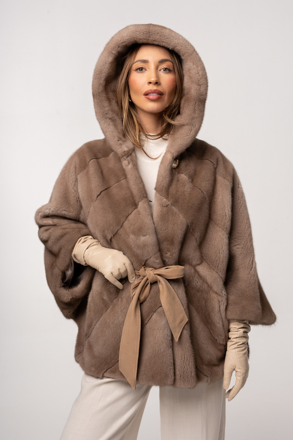 - Luksus w najczystszej postaci. Futro z norek typu poncho z kapturem w odcieniu beżu - pastel, zachwyca wyjątkowym połyskiem, gęstością i miękkością włosa, której nie da się porównać z żadnym innym materiałem.